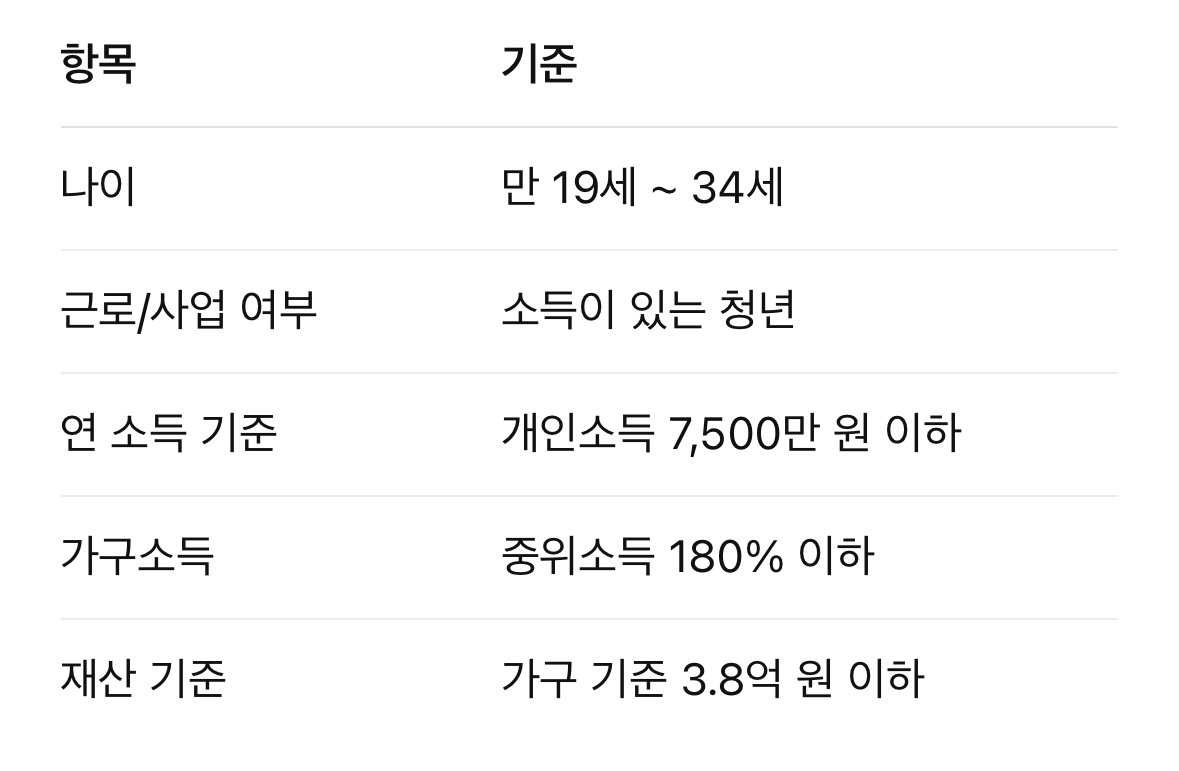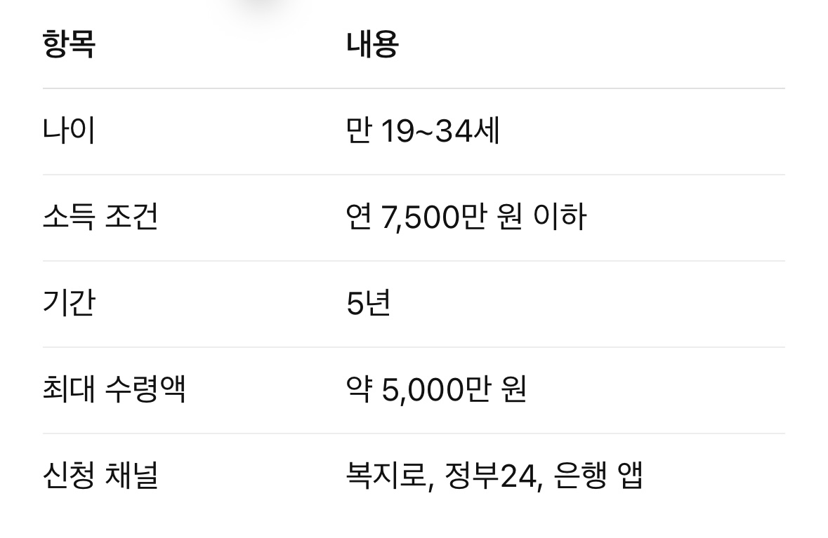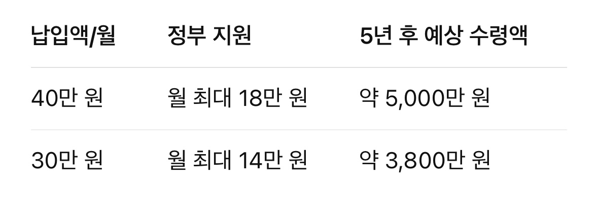 • 납입 기간: 5년 • 최대 지원금: 약 5,000만 원 (정부 매칭 + 이자 포함) • 목적: 청년 자산 형성, 주거/결혼/창업 등 미래 준비